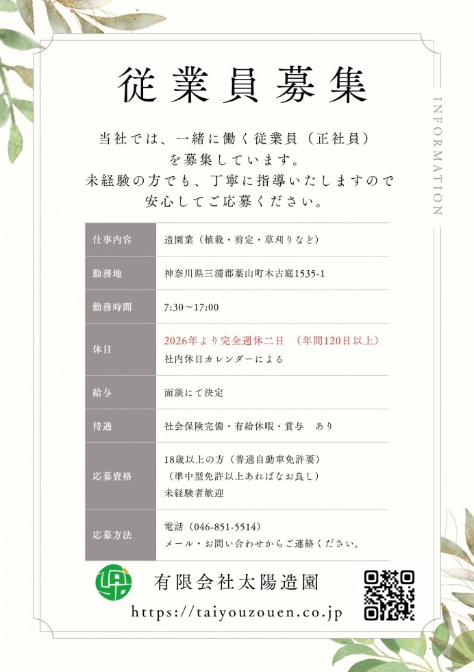 今後とも有限会社太陽造園をよろしくお願いいたします。